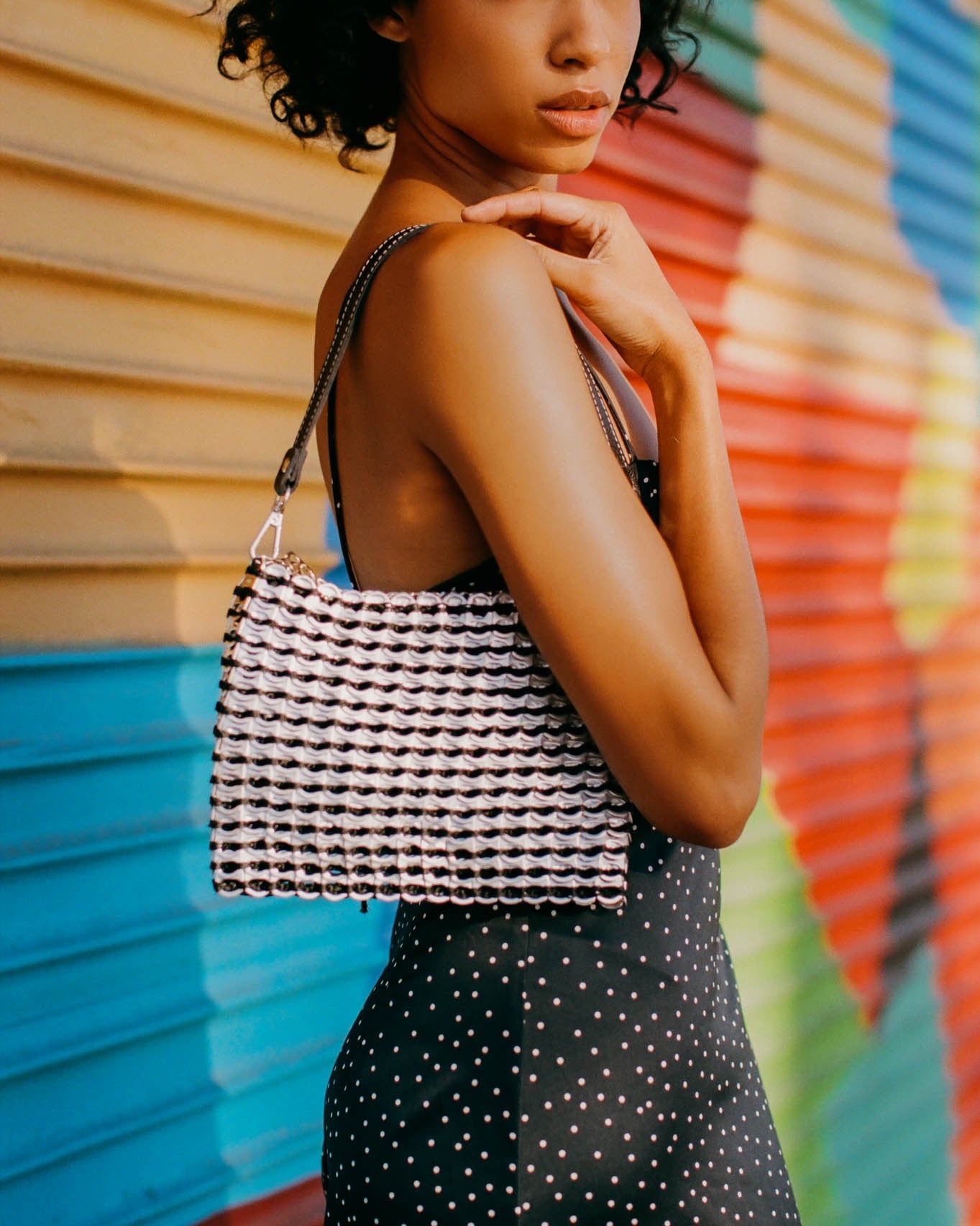 Material(s): Up-cycled aluminum, black leather strap with detachable clasps, steel double-filed curb chain, nylon brocade liner, custom cast metal zipper.